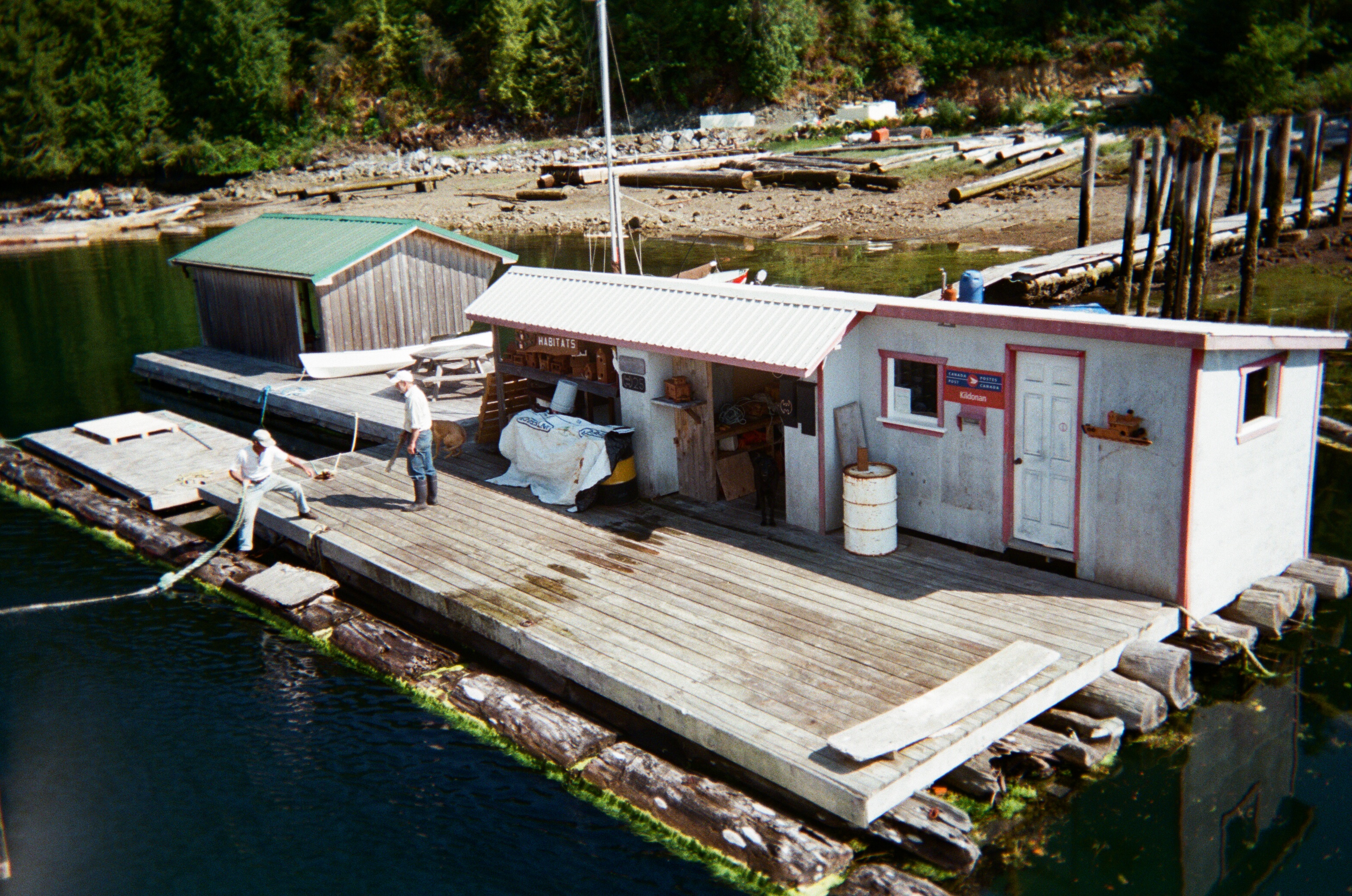 At the Kildonan Post Office, a lady hopped off the boat with a few newspapers, some shopping bags, and a parcel, then let herself into the PO and gathered the outgoing mail. A pair of wharf dogs gobbled treats tossed by crew members and barked their thank-yous. As the boat pulled away, the post mistress gathered up her bags and newspapers and trundled up the dock towards shore where a few houses were huddled.