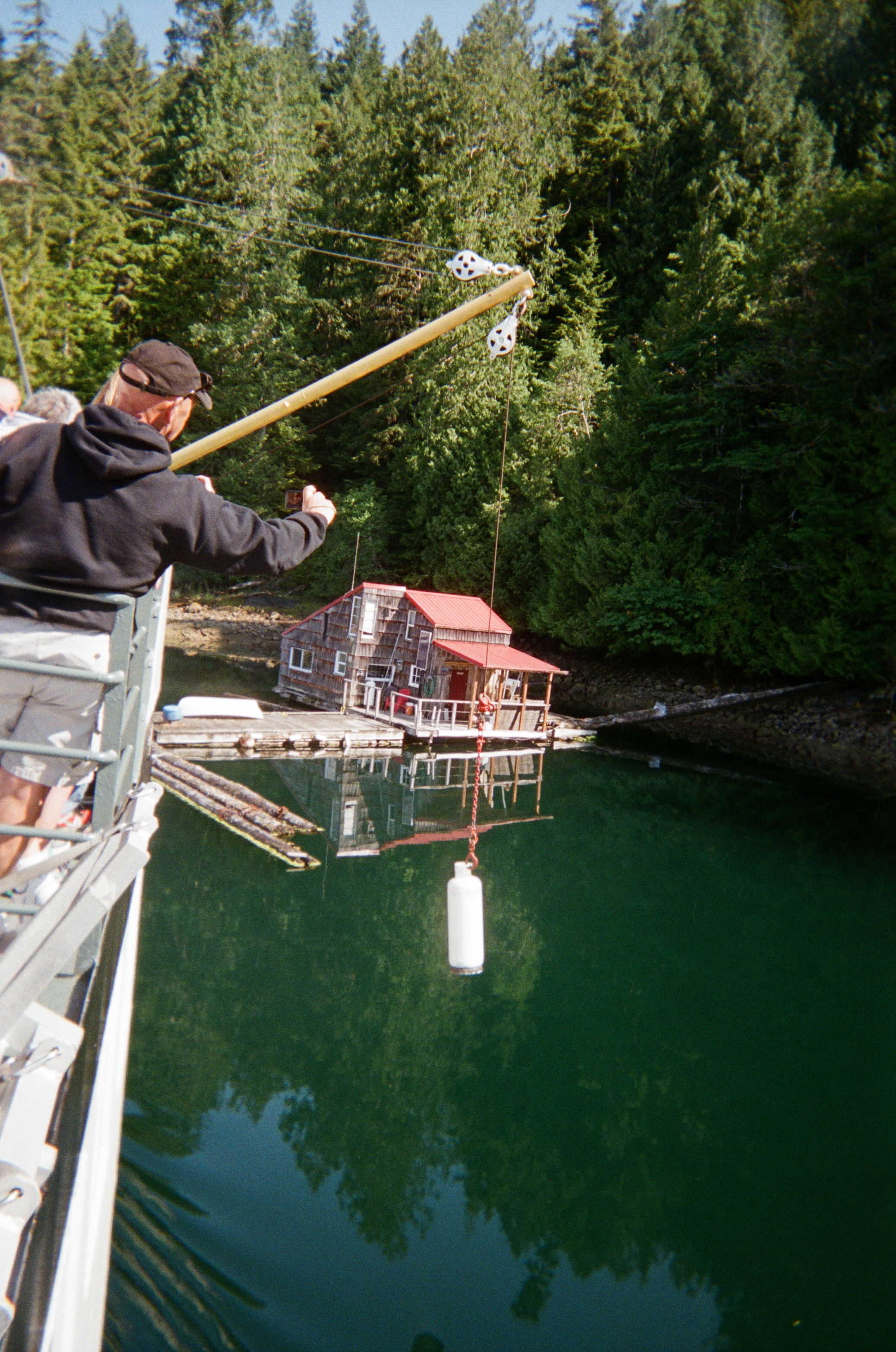 The boat stopped at Kildonan to drop off propane tanks on private docks next to float homes. A winch lowered the tanks and released them where they wobbled and came to rest, upright.