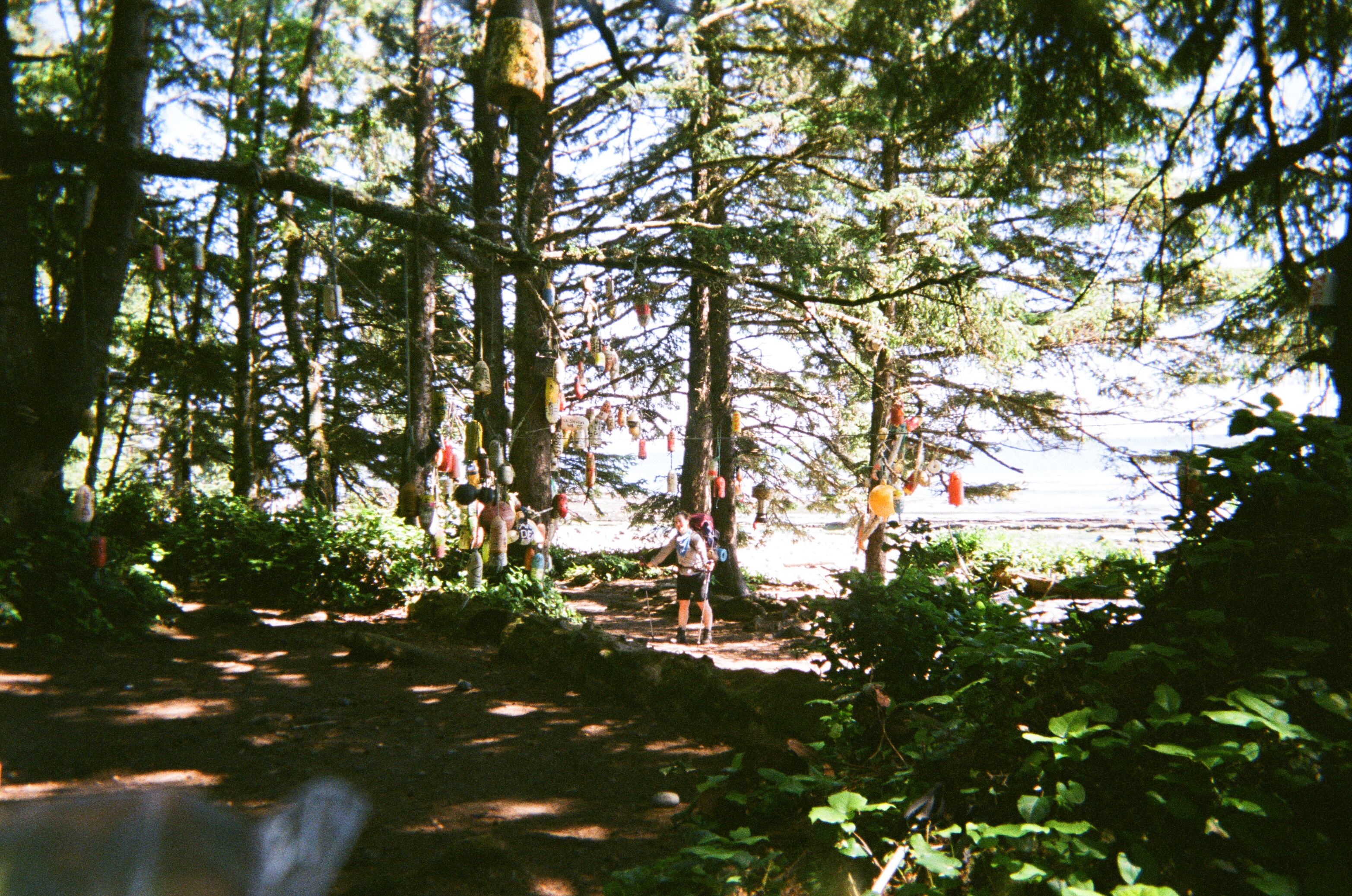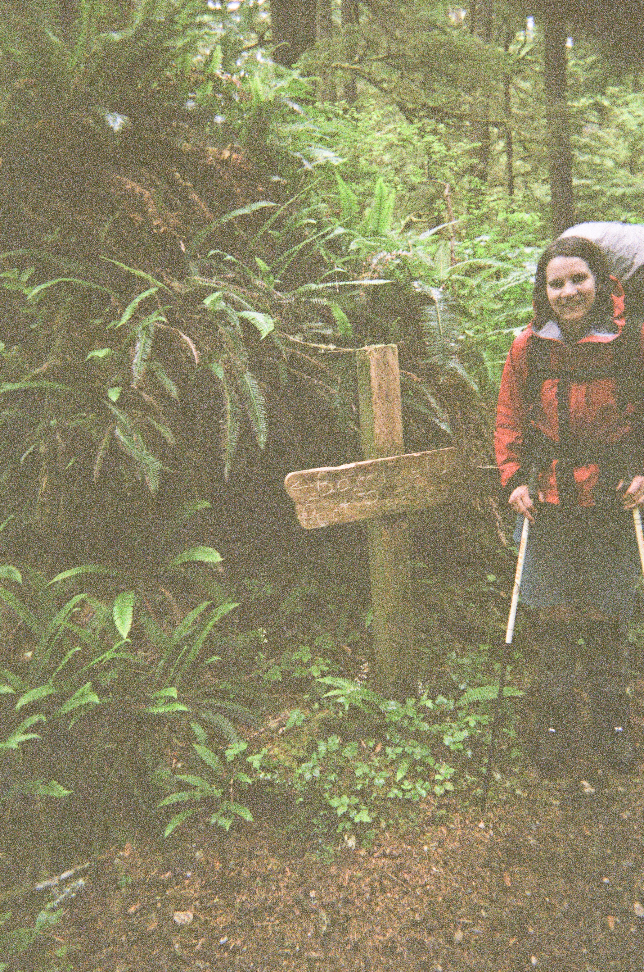 Near the Carmanah Lighthouse, arrows carved into a squat wooden sign gave a choice of two directions: Bamfield or Port Renfrew. The sign was ornamental, but it reminded me that the shipwrecked sailors who struggled to shore long ago might have been totally disoriented. (The disposable camera is showing its uneven quality here…but hey, it looks like we did the trail in the 1970s!)