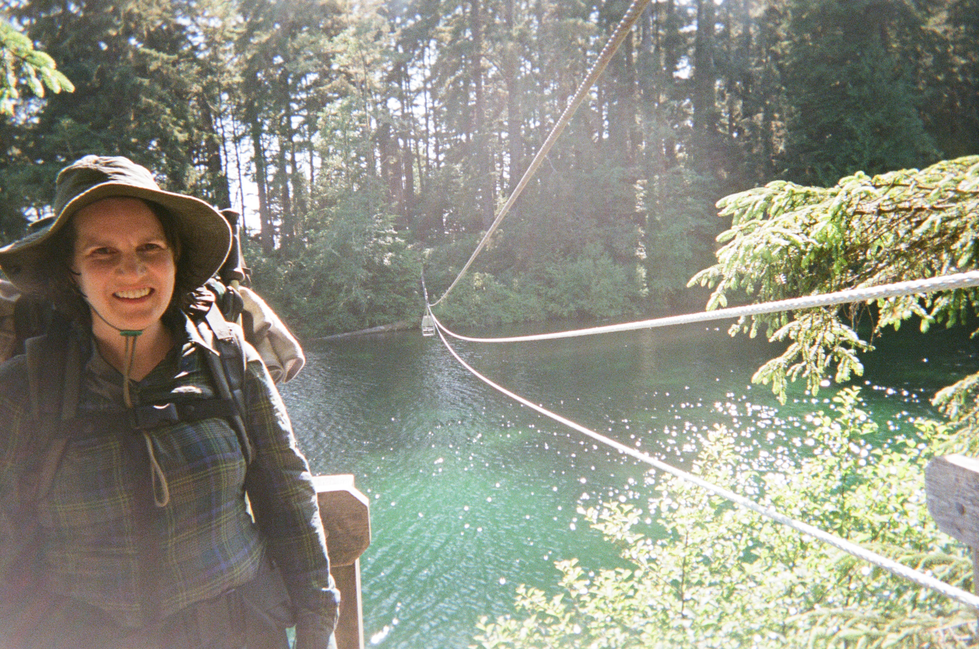 At KM 56 came the first ladders of the day down to Logan Creek. After about four flights, they spat us onto a suspension bridge—but this was not a bridge like the one at Pete Wolfe Creek (on the Juan de Fuca Trail near Mystic Beach) or the one in Lynn Valley, North Vancouver. In those places, the word “bridge” fits. The “bridge” at Logan Creek was just a narrow plank bounded by wire. I wasn’t sure my pack would even fit between the flimsy-looking “guard rails.” B pointed to a stack of fallen logs underneath the bridge. “That’s the old bridge,” she explained. “It fell down, and they built the new one over top it.” Not exactly reassured, I inched across.